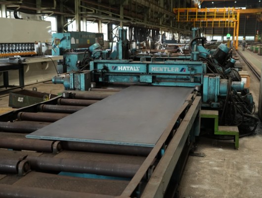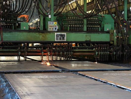 レベラーとは、コイル状に巻かれている鋼板を引き伸ばし、ロールで矯正する事で、歪みを取り除き平坦な鋼板を製造する機械です。当社の厚板レベラーは、九州最大級の設備能力を誇っており、板厚19mm、板幅(2,150mm)まで対応可能です。また、矯正力に優れているため、歪みを極限まで抑えた高品質な鋼板を生産できます。
