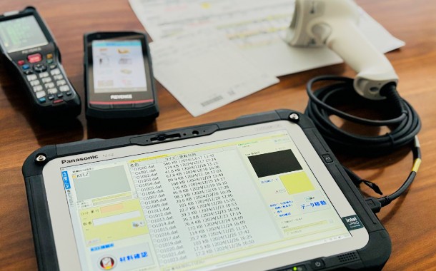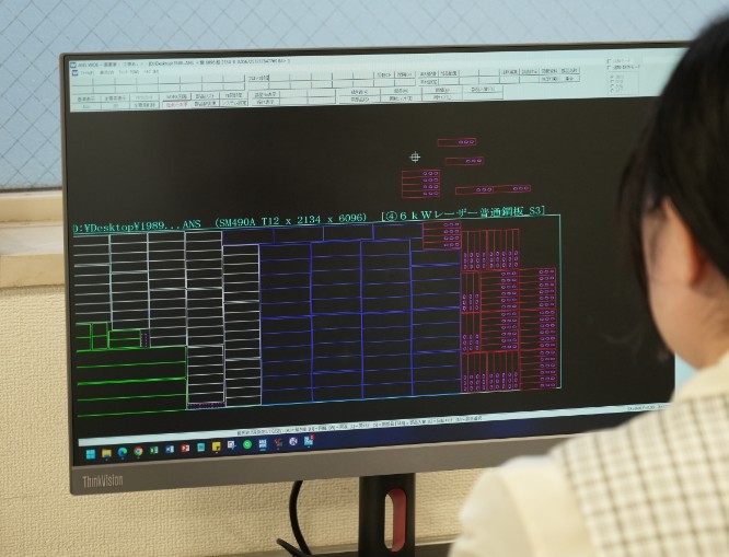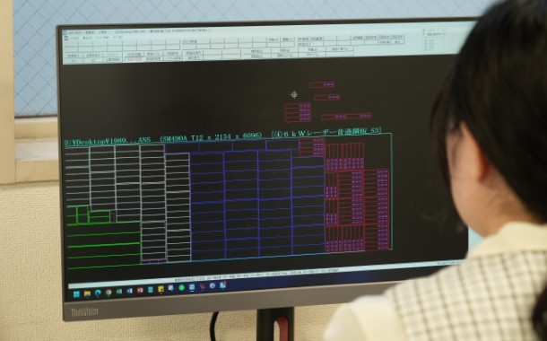 当社では、鋼板の仕入れからお客様へ製品を出荷するまで、すべての使用鋼材の現品識別管理と製造される製品情報の紐付け、チェック等を自社開発のシステムで行っており、その信頼性はお客様から高い評価をいただいております。さらに、上位システムと連携したスマートデバイスによる鋼材、加工状況の写真管理および、電子黒板システムなど業界最先端の取り組みも行われています。