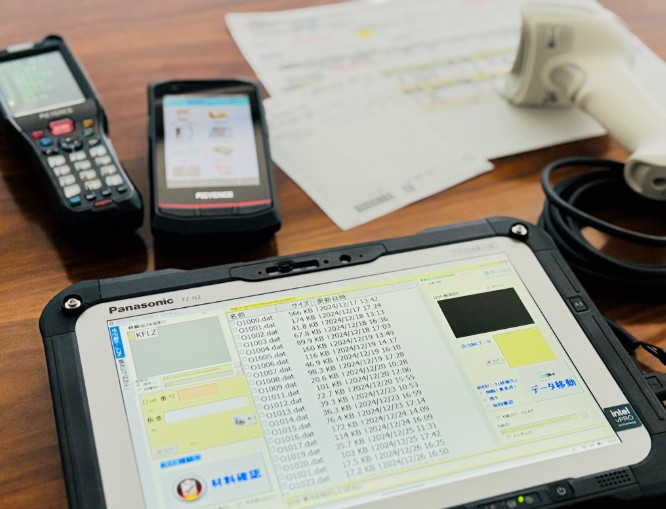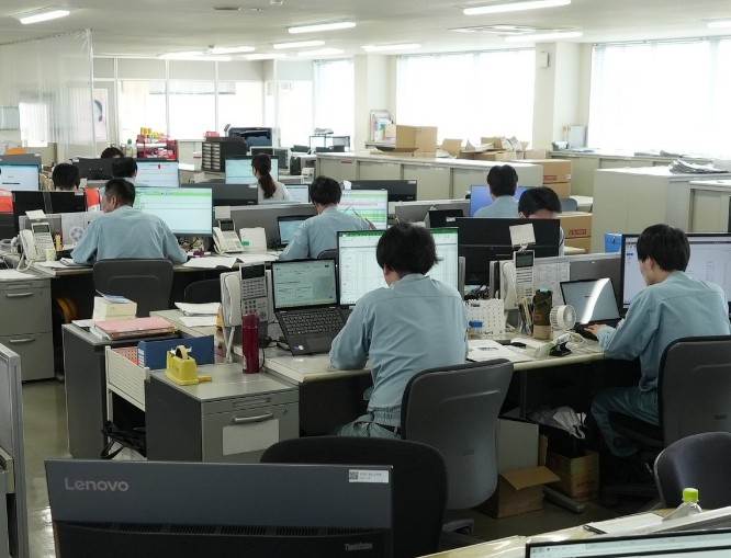 ホストコンピューターを通して、メーカーへの資材発注や加工ラインへ製品情報の共有を行う